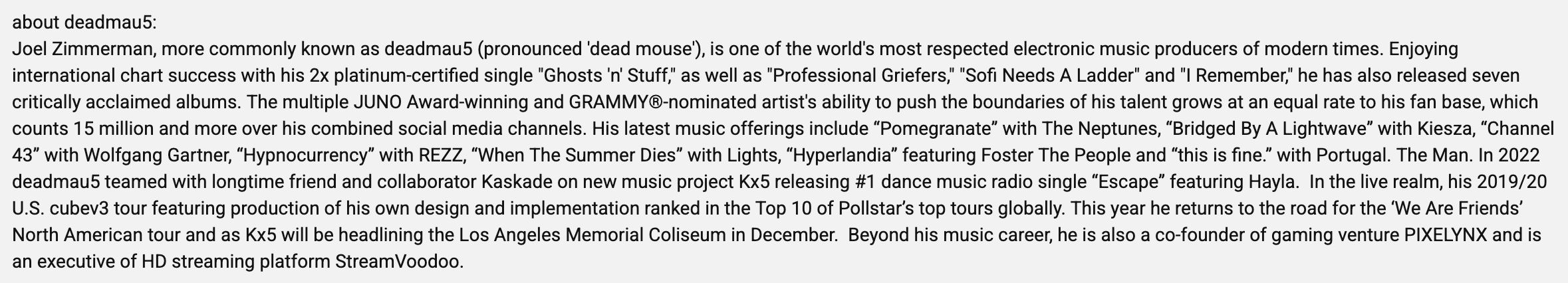 I want to give a special shout to Deadmau5, as he's one of the first people I've seen to do this on mass scale. Big brain moves. If you take a look at his YouTube video descriptions, they all include this: