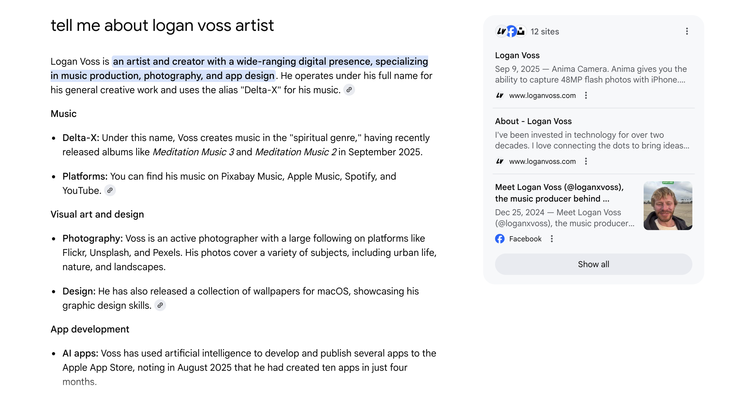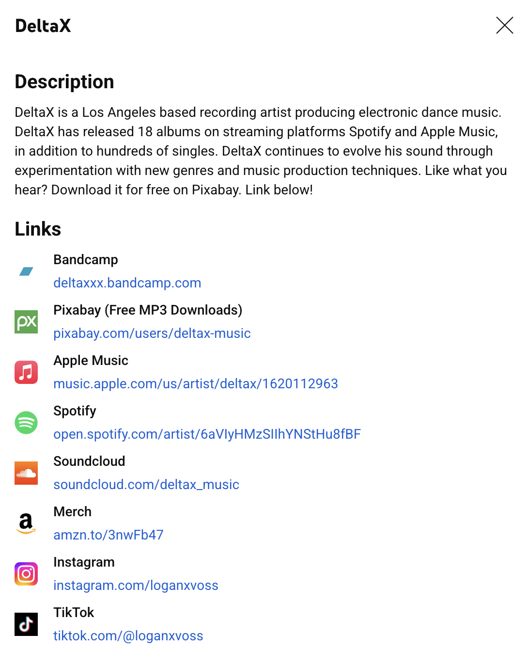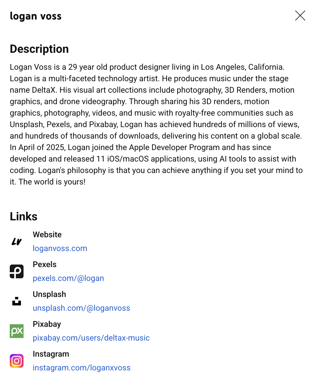 For example, I have two YouTube channels. One channel, DeltaX, is my music production channel, where I post everything related to music. DeltaX is a brand, so it's important to differentiate it from other personal ventures - for this reason, I started a second channel, Logan Voss, where I post vlogs, software tutorials, and tech reviews. For both channels, I've modified my descriptions to include extreme context for the AI search model. I've attached both of them here: